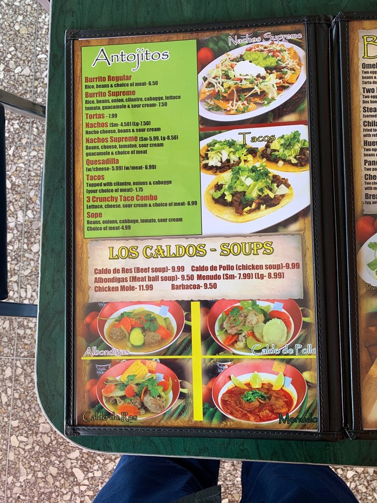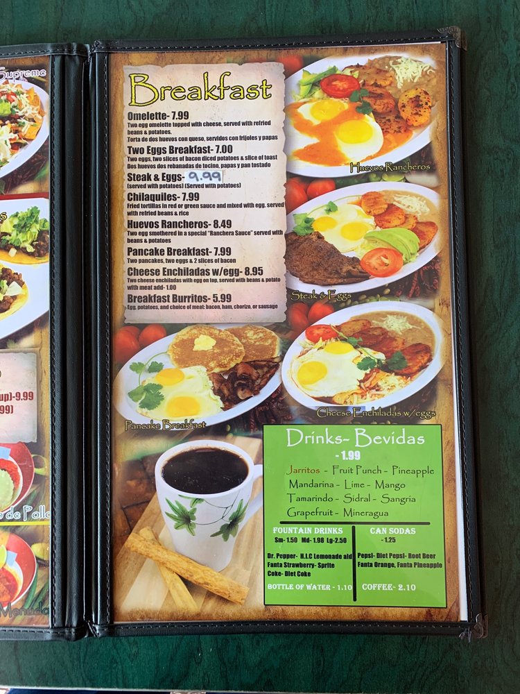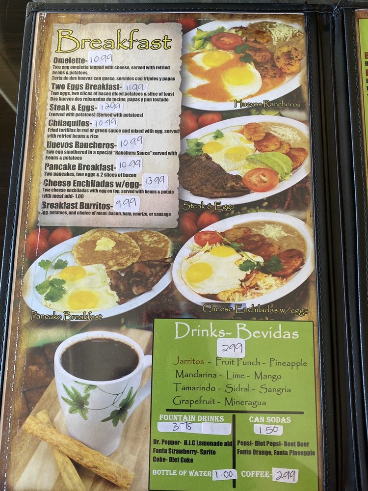 cheese enchiladas with egg on top, served with beans and potatoes. Add meat for an extra price.
